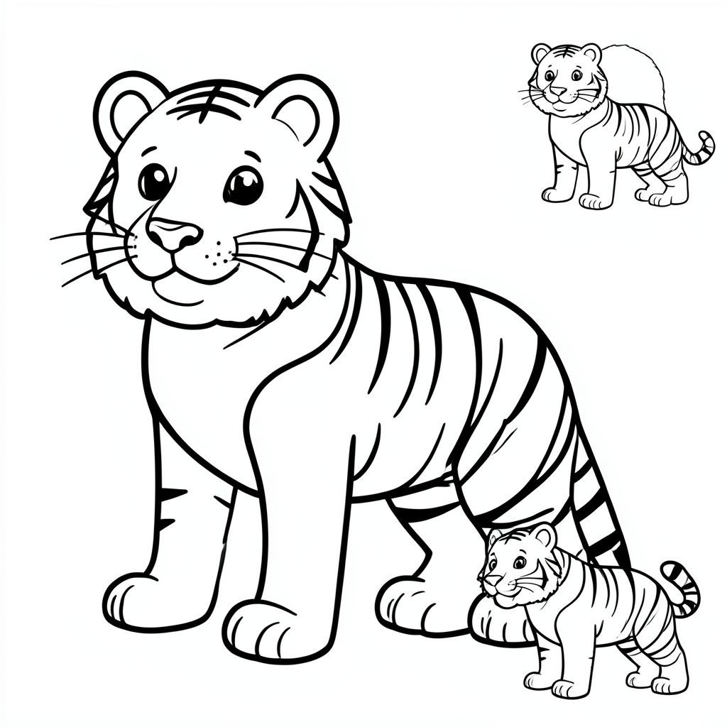 Tạo một bức tranh tô màu hổ dễ thương và đơn giản cho trẻ từ 3–6 tuổi. Bản vẽ hổ chính phải là nghệ thuật đường nét đen trắng, to và rõ ràng, với các hình dạng đơn giản phù hợp để tô màu. Bao gồm một hình ảnh tham khảo nhỏ, đầy đủ màu sắc của con hổ ở góc để trẻ có thể nhìn thấy màu sắc chính xác. Làm cho phong cách thân thiện, vui vẻ và mang tính giáo dục. Nền trắng, không có yếu tố phụ."