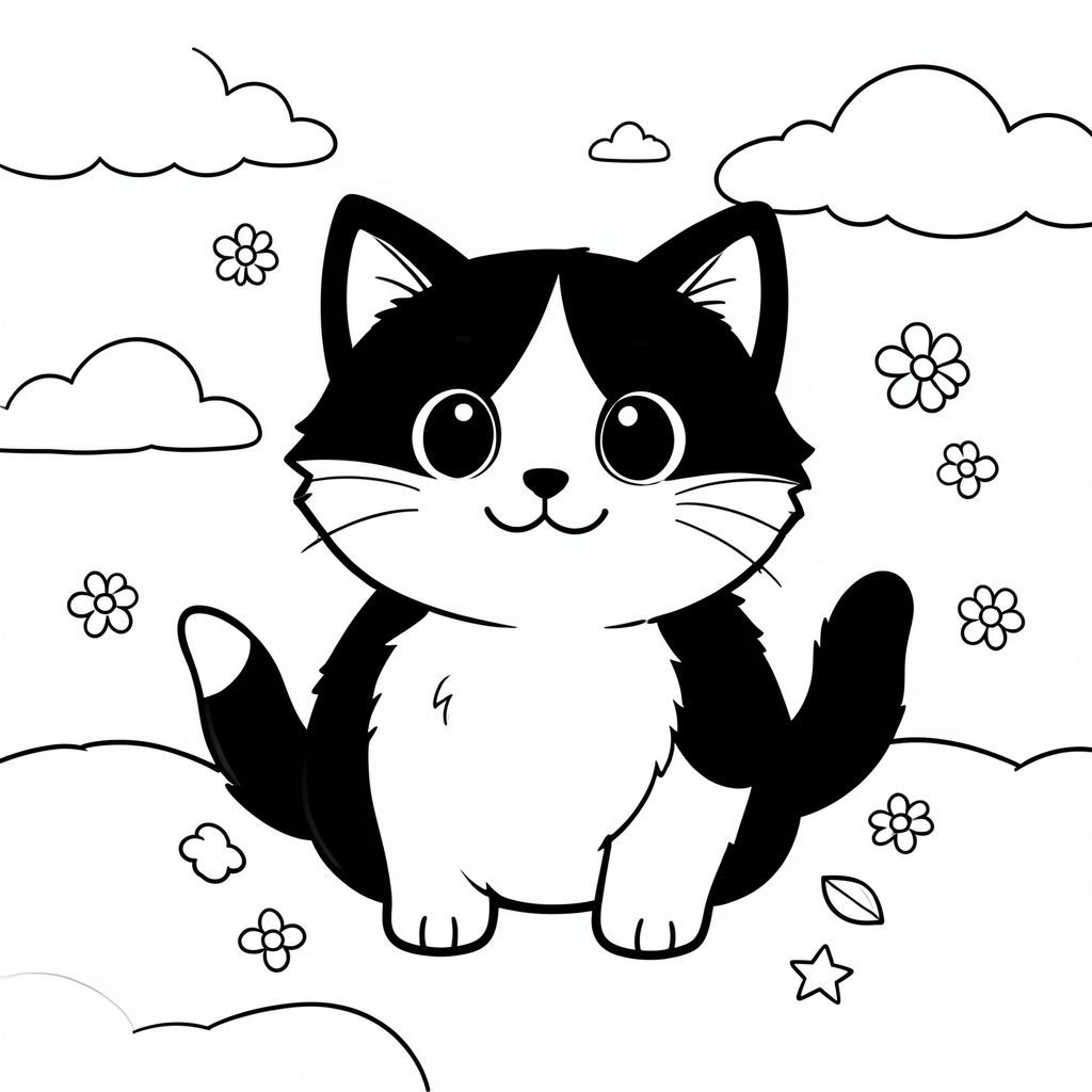 Tạo một hình minh họa vui vẻ về một con mèo nhỏ màu đen và trắng lông tơ. Con mèo nên được tập trung và biểu cảm của nó phải hoàn toàn đáng yêu - đôi mắt to, biểu cảm với nụ cười dịu dàng. Nó phải có một cái bụng tròn, hơi đầy đặn. Những đường nét đơn giản, dày, đậm xác định hình dạng của mèo. Kết hợp một vài hình dạng nhỏ, cong - có thể là một cánh hoa nhỏ hoặc một ngôi sao - nằm rải rác xung quanh gốc của nó. Nền nên bao gồm một đám mây mềm, hơi mờ, rải rác với một vài bông hoa thu nhỏ, cách điệu. Tâm trạng tổng thể phải là một trong những hạnh phúc và mãn nguyện thuần khiết, ngây thơ. Tập trung vào cảm giác ấm áp và niềm vui nhẹ nhàng. Không từ, không số, không nhãn, chỉ có sự quyến rũ thị giác thuần túy., tranh tô màu đen trắng, phong cách lowbook, nghệ thuật đường nét, đơn sắc, không màu, không đổ bóng, không xám, không tô