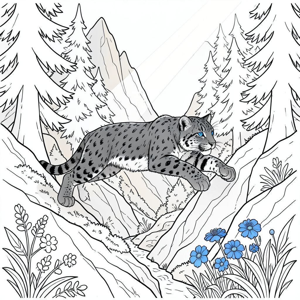 Tạo một trang tô màu đen trắng, dành riêng cho nghệ thuật đường nét. Tâm điểm là một con báo tuyết, sải bước giữa qua một sườn núi lởm chởm, phủ đầy rêu. Bộ lông của con báo có màu xám khói đậm, được đánh dấu bởi một miếng che mắt màu xanh ngọc bích duy nhất, rực rỡ. Nó đang nhảy, đón một luồng ánh sáng mặt trời nhạt xuyên qua tán cây thông cổ thụ rậm rạp giáp với một dãy núi đá dốc. Những ngọn núi được thể hiện với màu xám nhạt và màu be hơi trầm, tạo cảm giác sâu sắc và khoảng cách. Một dòng suối nhỏ, ẩn nhỏ giọt xuống sườn núi về phía một mảng hoa dại màu xanh rực rỡ, gần như phát quang. Bầu không khí tổng thể nên mơ mộng và hơi u sầu, nhấn mạnh vào các đường nét sắc nét, rõ ràng - gần như điêu khắc về độ chính xác của chúng. Đường nét nên tạo ra cảm giác tinh tế, có kết cấu, gợi ý gió và tuyết. Hãy nghĩ về một khoảnh khắc chuyển động yên tĩnh, mạnh mẽ. Tập trung vào việc truyền tải cảm giác bí ẩn cổ xưa và vẻ đẹp thanh tao thông qua sự tương phản rõ rệt của màu đen và trắng. Khung cảnh nên được đặt trong một thung lũng hẹp, có mái che. Mong muốn chi tiết tối thiểu, ưu tiên hình dạng và trọng lượng vốn có của con vật.