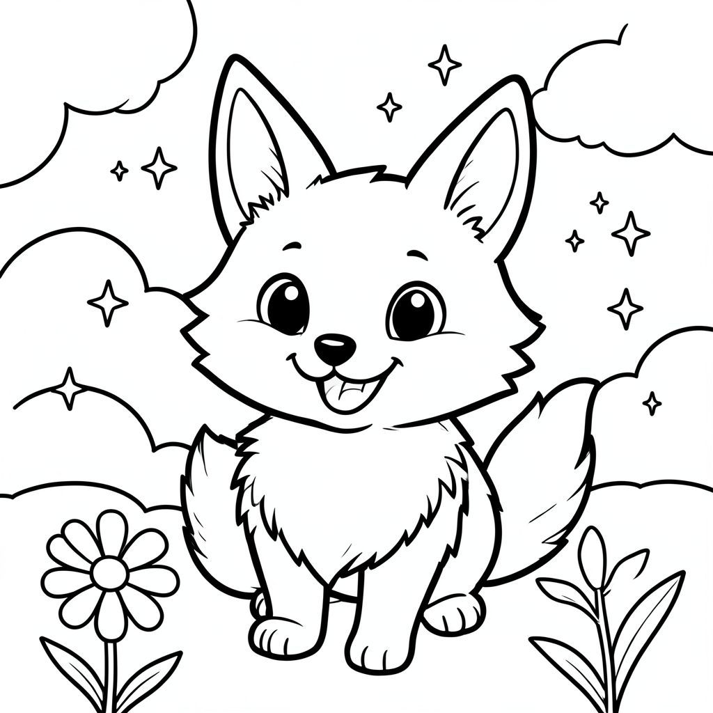 Tạo một trang tô màu đen trắng rực rỡ có hình một con vật lông tơ, quyến rũ - một con cáo hoặc thỏ nhỏ, thân thiện - ở trung tâm. Con vật phải có đôi mắt to, biểu cảm và nụ cười rộng, chân thành. Các đường nét phải dày và đậm, tạo cảm giác chuyển động mạnh mẽ và vui tươi. Bộ lông của con vật nên có kết cấu, nhiều lớp. Bao gồm nền mềm mại, hơi mờ của những đám mây mịn, một bông hoa dại vui vẻ và rải rác các ngôi sao lấp lánh. Tâm trạng tổng thể nên là một trong những hạnh phúc thuần khiết và kỳ diệu nhẹ nhàng. Tập trung vào một thẩm mỹ đơn giản, gọn gàng - chỉ có con vật và biểu cảm vui vẻ của nó. Hãy nghĩ về một hình minh họa cổ điển, vượt thời gian.