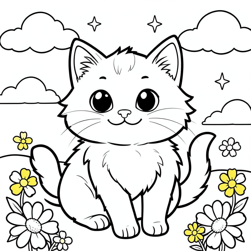 Tạo một trang tô màu đen trắng rực rỡ, vui vẻ với một chú mèo lông bông, đáng yêu. Con mèo phải là tâm điểm trung tâm, được hiển thị với các đường nét cực kỳ dày, đậm tạo cảm giác mạnh mẽ, tràn đầy năng lượng. Các đường nét nên nhấn mạnh hình dạng của con mèo và tạo cho nó một sự hiện diện hơi vui tươi, năng động. Đặc điểm của mèo là tối quan trọng: đôi mắt to, biểu cảm, lấp lánh thích thú, nụ cười dịu dàng, hơi hếch lên và đôi má tròn mềm mại. Bộ lông của mèo phải trông mềm mại và hấp dẫn. Nền phải tối giản và vui vẻ: hãy tưởng tượng những đám mây mịn trôi trên bầu trời xanh nhạt, rải rác những bông hoa màu vàng tươi và một vài ngôi sao lấp lánh. Tâm trạng tổng thể là một trong những hạnh phúc và mãn nguyện thuần túy. Tập trung vào một bầu không khí yên bình, thanh bình. Duy trì độ đậm dòng nhất quán, mạnh mẽ trong toàn bộ trang. Bảng màu nên chủ yếu là xám và trắng, với các biến thể tinh tế để tạo chiều sâu. Hãy nghĩ về một khung cảnh nhẹ nhàng, lạc quan.