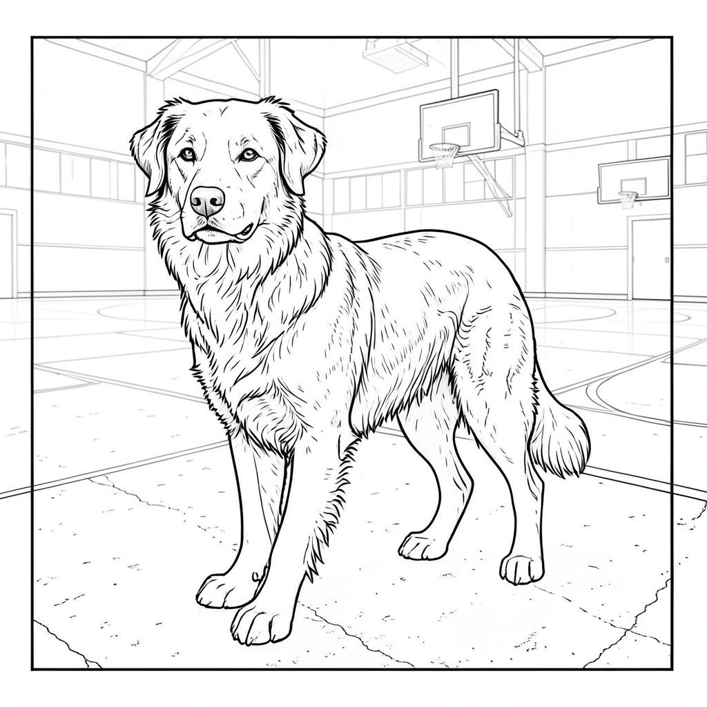 Trọng tâm trung tâm là một duy nhất, được kết xuất hoàn hảo. Đó là một giống chó cỡ trung bình - có thể là Border Collie hoặc German Shepherd - với thân hình hơi gầy, cơ bắp. được đặt trong tư thế hơi nghiêng, nhìn thẳng vào người xem với biểu cảm bình tĩnh, cảnh giác. Đầu của nó hơi nghiêng, truyền tải trí thông minh. Bộ lông của nó là một , sô cô la đậm đà , với sự thay đổi tinh tế về bóng râm - hơi sẫm màu trên mõm và xung quanh tai. Bộ lông có kết cấu chân thực, hơi gợn sóng. Đó là một cái đầu duy nhất, được hình thành hoàn hảo.