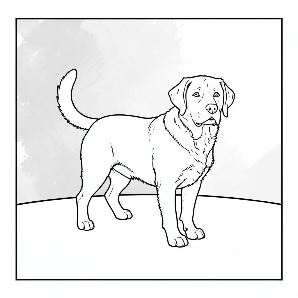 Một duy nhất, cân đối hoàn hảo, được đặt lệch tâm, hơi hướng về bên phải. được đặt chính giữa trong khung hình. Nó có tư thế hơi thoải mái - một đường cong nhẹ nhàng về phía lưng và đầu hơi hướng về phía trước, hơi nhìn về phía người xem. Đó là một cỡ trung bình - có kích thước gần bằng một con Labrador. Đó là một màu , với kết cấu tinh tế, hơi nhô lên trên bộ lông của nó. Bộ lông đơn giản và hơi gợn sóng, không quá chi tiết. Nó được định vị sao cho đuôi của nó hơi hướng lên trên, tạo ra một đường cong nhẹ nhàng.