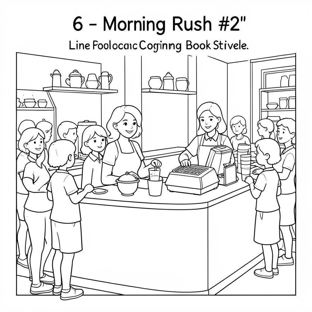 Trang 6 - Morning Rush # 2: "Nghệ thuật đường nét của một quầy cà phê bận rộn với các nữ nhân viên pha chế phục vụ đồ uống, cốc và máy tính tiền có thể nhìn thấy, nhiều người, đường viền sạch sẽ, phong cách sách tô màu."