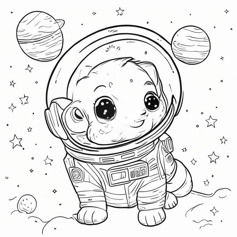 Trang sách tô màu động vật dễ thương, đường viền đen dày đậm, đường nét mượt mà đơn giản, không đổ bóng, không xám, nền trắng, phong cách vui tươi cho trẻ em, chó phi hành gia khám phá không gian