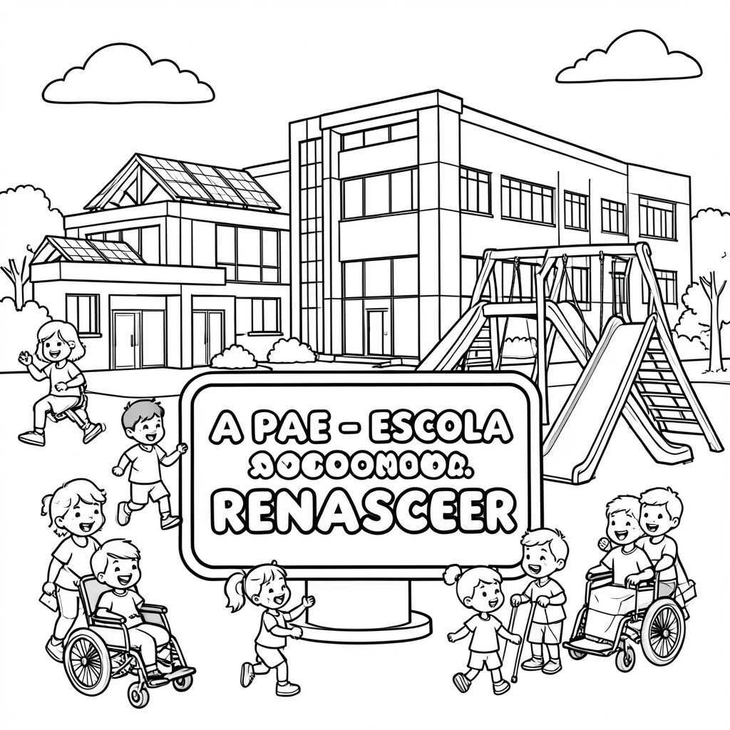 Tranh tô màu đen trắng cho trẻ em. Một tòa nhà trường học tương lai với kiến trúc hiện đại, các tấm pin mặt trời và sân chơi với cầu trượt, xích đu và đường dốc. Ở phía trước trung tâm, một ** bảng hiệu hoặc bảng hiệu trang trí lớn hiển thị nổi bật tên "A P A E - E S C O L A R E N A S C E R" ** bằng các chữ cái bong bóng lớn, đậm, cách nhau và dễ tô màu. Trẻ em vui vẻ vui chơi, mỉm cười và tương tác xung quanh sân chơi, bao gồm cả trẻ em mắc các hội chứng và khuyết tật khác nhau, sử dụng xe lăn, nạng hoặc các thiết bị hỗ trợ khác, thể hiện sự hòa nhập và khả năng tiếp cận. Đường viền dày đơn giản, phong cách sách tô màu, nền trắng, khung cảnh vui tươi và giàu trí tưởng tượng, hoàn hảo cho trẻ em tô màu.