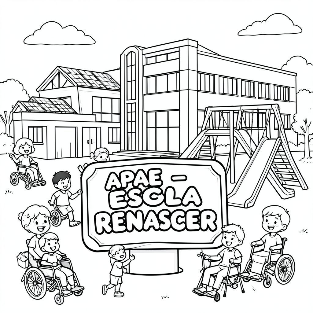 Tranh tô màu đen trắng cho trẻ em. Một tòa nhà trường học tương lai với kiến trúc hiện đại, các tấm pin mặt trời và sân chơi với cầu trượt, xích đu và đường dốc. Ở phía trước trung tâm, một ** bảng hiệu hoặc bảng hiệu trang trí lớn hiển thị nổi bật tên "APAE - ESCOLA RENASCER" ** bằng các chữ in đậm, bong bóng lớn, dễ tô màu và dễ đọc rõ ràng. Trẻ em vui vẻ vui chơi, mỉm cười và tương tác xung quanh sân chơi, bao gồm cả trẻ em mắc các hội chứng và khuyết tật khác nhau, sử dụng xe lăn, nạng hoặc các thiết bị hỗ trợ khác, thể hiện sự hòa nhập và khả năng tiếp cận. Đường viền dày đơn giản, phong cách sách tô màu, nền trắng, khung cảnh vui tươi và giàu trí tưởng tượng, hoàn hảo cho trẻ em tô màu.