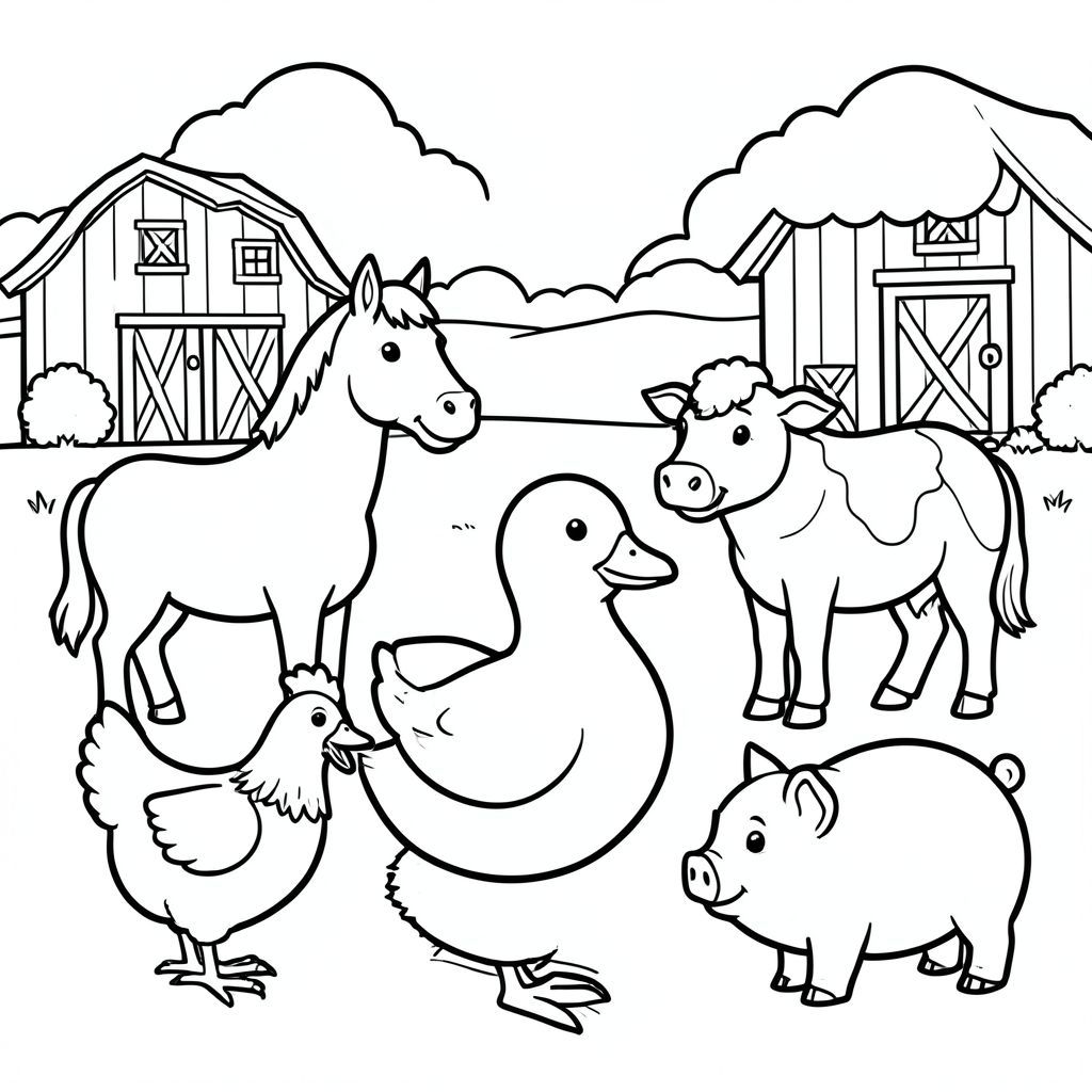 Tranh tô màu đen trắng cho trẻ em từ 3-5 tuổi, phong cách giáo dục rất đơn giản, đường viền đậm dày, không đổ bóng, không xám, có trang trại ở nền, trung tâm vịt trưởng thành, ngựa, bò, gà mái, lợn, chi tiết tối thiểu, biểu hiện thân thiện, nền trắng sạch, phong cách vector, A4 có thể in được, trang sách tô màu trẻ em