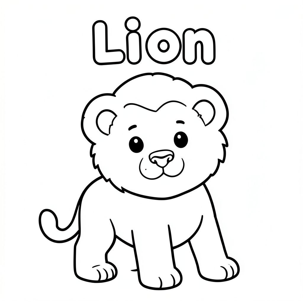 Tranh tô màu đen trắng cho trẻ em, từ "Sư tử" được viết ở trên cùng bằng các chữ cái bong bóng chữ hoa đậm, ở giữa, bên dưới là một Sư tử con dễ thương, đường viền dày đậm sạch sẽ, hình dạng đơn giản, không gian tô màu mở lớn, không đổ bóng, không xám, không màu, nền trắng, bố cục trung tâm, trang 8,5x11 inch có thể in được, nghệ thuật đường nét phong cách sách tô màu