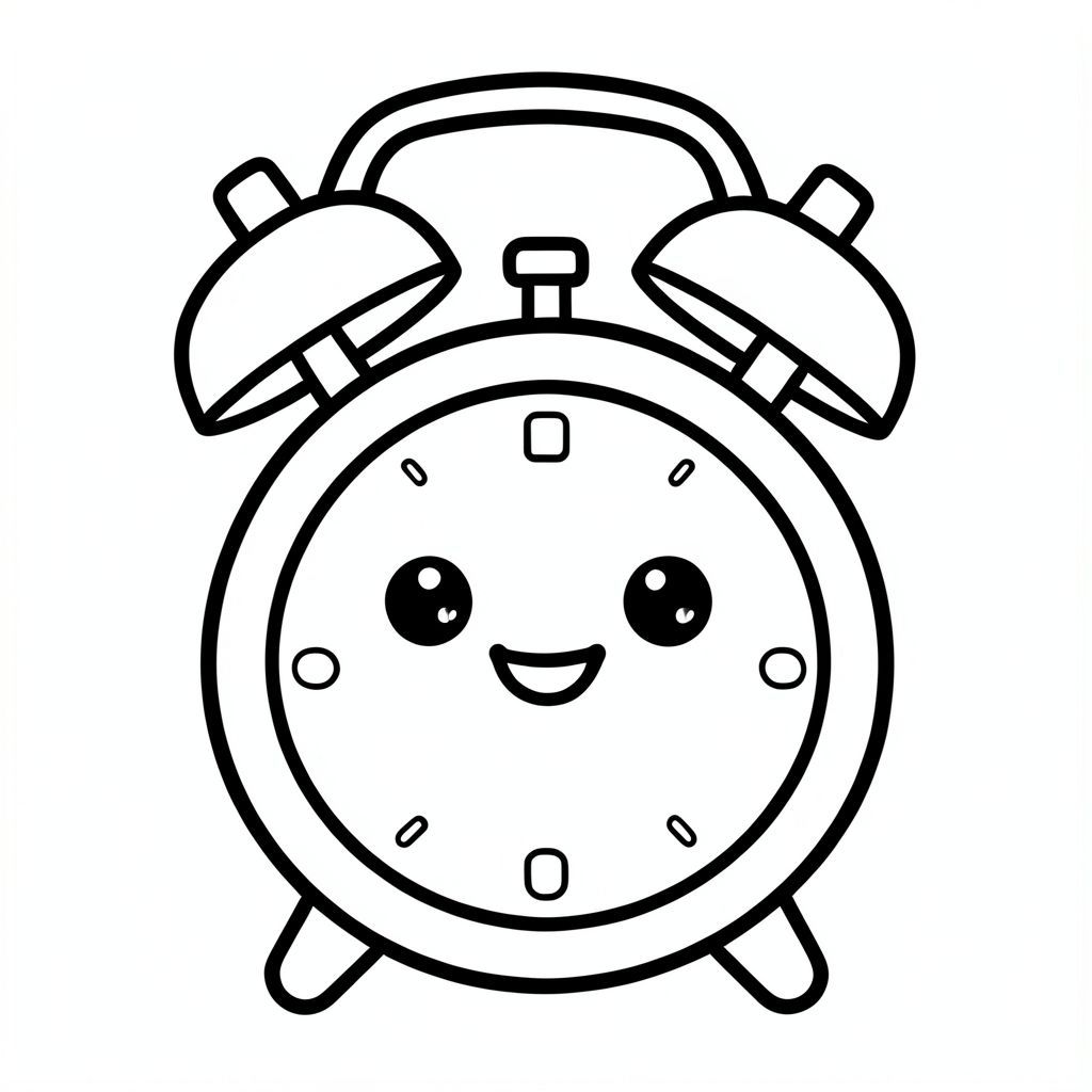 Tranh tô màu đen trắng đơn giản, đường dày cực đậm, chuông đồng hồ báo thức lớn, giữa, không có nền, phong cách trẻ mới biết đi. phong cách kawaii dễ thương, khuôn mặt cười