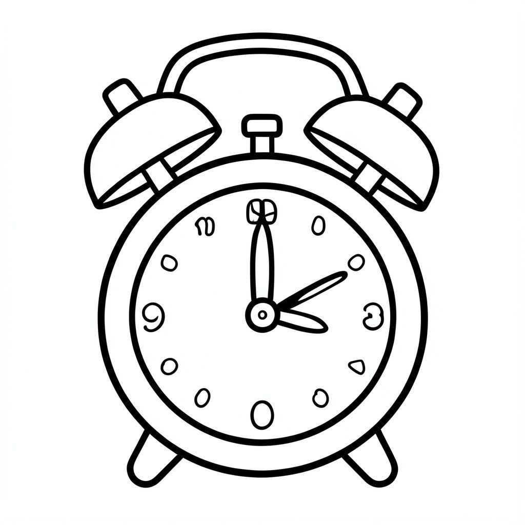Tranh tô màu đen trắng đơn giản, đường dày đậm, chuông đồng hồ báo thức lớn, giữa, không có nền, kiểu trẻ mới biết đi. Phong cách kawaii dễ thương