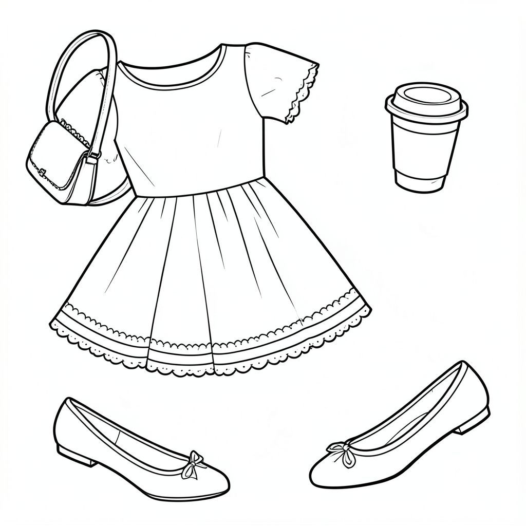 Tranh tô màu đơn dòng táo bạo và dễ dàng, trang phục hẹn hò nữ tính dễ thương cho buổi hẹn hò cà phê, có một chiếc váy ống loe ngắn tay quyến rũ làm món đồ chính, một đôi giày ba lê đơn giản phù hợp, một chiếc túi đeo chéo có cấu trúc nhỏ và một tách cà phê mang đi, được sắp xếp theo một bố cục biên tập thời trang và sáng tạo đặc biệt. Thay đổi góc nhìn đáng kể để trang này tạo cảm giác phong cách, tươi mới và bóng bẩy về mặt hình ảnh. Không đặt các đồ vật theo một đường thẳng cứng và không để quần áo ở một góc phẳng lặp đi lặp lại. Khoe chiếc váy từ một góc phẳng xoay mới với một chiếc váy xòe duyên dáng, đặt túi đeo chéo ở một hướng khác, nghiêng hai đôi ba lê ở các góc bổ sung nhưng khác nhau và nghiêng tách cà phê riêng biệt để toàn bộ trang cảm thấy ấm cúng, cân bằng, thời trang và mới mẻ về mặt hình ảnh.