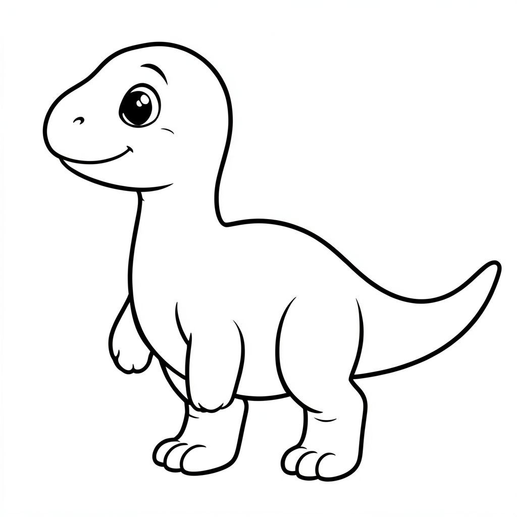 Tranh tô màu khủng long Futalognkosaurus dễ thương cho trẻ em, chế độ xem toàn thân, biểu cảm khuôn mặt em bé, mắt to tròn, má mũm mĩm, nụ cười nhỏ dịu dàng, cổ dài, đầu nhỏ, cơ thể tròn lớn, chân khỏe, đuôi dài, đường viền dày rõ ràng đậm, chỉ nghệ thuật đường đen trắng, không đổ bóng, không thang độ xám, không màu, nền trắng, trang sách tô màu có thể in, độ phân giải cao, thành phần tập trung.