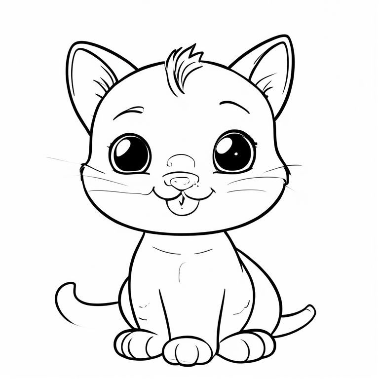 Tranh tô màu mèo dễ thương cho trẻ em, phong cách hoạt hình đơn giản, nghệ thuật đường nét đen trắng, đường viền dày, không đổ bóng, nền trắng