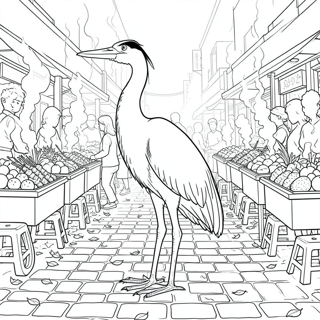 Bối cảnh là một khu chợ thức ăn đường phố ngoài trời đông đúc, nhộn nhịp. Đó là một cảnh hỗn loạn nhưng được kết xuất tỉ mỉ. Những hàng xe đẩy rực rỡ được nhồi nhét vào nhau, tràn ngập thức ăn bốc hơi - xiên thịt nướng, rau, bánh ngọt và trái cây lấp lánh. Khói bốc lên từ nhiều vỉ nướng, tạo ra một bầu không khí ấm áp, mờ mịt. Mặt đất là một mảng chắp vá của đá cuội và đất chật chội, với những chiếc lá rụng rải rác và những chiếc ghế nhựa nhỏ, rực rỡ. Một vài người đang đi xung quanh, một phần bị che khuất bởi chuyển động của các quầy hàng. Ấn tượng tổng thể là một trong những năng lượng và trải nghiệm giác quan hơi choáng ngợp. Hơi khuếch tán, gợi ý một buổi chiều u ám. Có những phản chiếu tinh tế trên những viên đá cuội, bắt được . Góc nhìn hơi thấp, nhìn lên Diệc. Phân tích chi tiết - Các yếu tố & cân nhắc: * * A , tắt tiếng - bóng tối hơn một chút so với . * Cơ thể của Diệc thon dài và hợp lý, với tư thế mạnh mẽ, hơi ngoằn ngoèo. Hệ cơ bắp được xác định một cách tinh tế. * Đầu lớn, có cấu hình hơi dẹt. Đôi mắt nhỏ, và tập trung. Mỏ được xác định rõ ràng. Có một đường cong tinh tế ở đầu, gợi ý về một phong độ hơi vương giả. * Đuôi dài và dày, a, bóng. Nó hơi cong lên trên, cung cấp một đối trọng tinh tế cho cơ thể của Diệc. Một gợn sóng nhỏ, tinh tế trên lông đuôi sẽ làm tăng thêm tính chân thực. * Giải phẫu của Diệc được thể hiện cẩn thận - đường cong tinh tế của cổ, góc nhẹ của chân, kết cấu da mịn màng. Không có xương hoặc khớp có thể nhìn thấy được. * Da được hiển thị với kết cấu tinh tế - chất lượng hạt nhẹ, cho thấy bề mặt hơi thô ráp. * * Chủ yếu là tông màu ấm - cam, đỏ, vàng, nâu và xanh lá cây. * Mật độ của các quầy hàng và thức ăn cố tình cao, tạo cảm giác có chiều sâu và chuyển động. * Các hình ảnh nhỏ, cách điệu của các mặt hàng thực phẩm - xiên thịt, rau, trái cây và bánh ngọt - nằm rải rác khắp cảnh. Khói từ vỉ nướng được thể hiện bằng các đường viền tinh tế, mờ mịt của và. * Đá cuội có kết cấu hơi không đồng đều, với những thay đổi nhỏ về màu sắc và bóng râm. Một vài chiếc lá rải rác được thêm vào để tạo sự quan tâm trực quan. * Mềm mại, khuếch tán đến từ bên trái, tạo ra các điểm sáng và bóng nhấn mạnh kết cấu của cảnh. * * Các đường cực kỳ mỏng, gần như không thể nhận thấy. Mỗi đường được vẽ chính xác. * Các thay đổi tinh tế về độ dày của dòng để tạo cảm giác về khối lượng và chiều sâu. * Hoàn toàn không đổ bóng. Toàn bộ hình ảnh được hiển thị bằng màu trắng. * Không có bất kỳ màu nào lấp đầy. Màu trắng là màu duy nhất. * Hậu cảnh cố tình trống rỗng, tập trung sự chú ý của người xem hoàn toàn vào Diệc. Bầu Không Khí Tổng Quát: Ảnh nhằm mục đích gợi lên cảm giác về một môi trường đô thị bận rộn và hơi hỗn loạn. Đó là một nghiên cứu hoàn toàn trái ngược - sự hiện diện mạnh mẽ, đơn độc của Heron chống lại hoạt động đông đúc của chợ thức ăn đường phố.