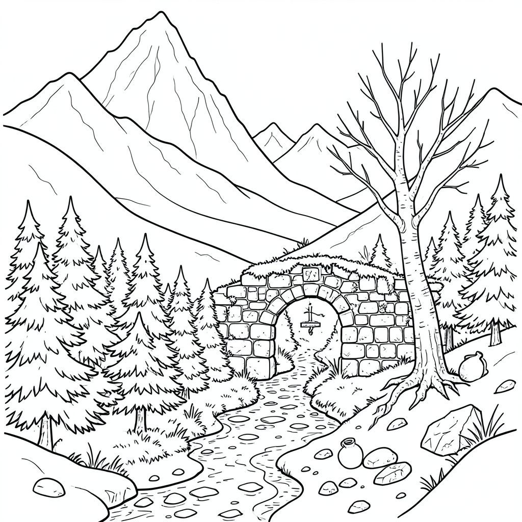 Một khu rừng thông còi cọc duy nhất chiếm phần hạ lưu của thung lũng, kim của nó tạo thành một hàng rào dày đặc, gần như không thể xuyên thủng. Bên dưới những cây thông, một bức tường đá nhỏ, đổ nát, chỉ hơn một cổng vòm bị phong hóa, đánh dấu bìa rừng. Bức tường được xây dựng bằng đá granit, nhuộm màu, gây bất ổn bởi nhiều thế kỷ mưa và địa y. Một chiếc đồng hồ mặt trời phủ đầy rêu đứng ở trung tâm của cổng vòm, gnomon của nó chỉ thẳng về phía đỉnh cực bắc. Mặt đất xung quanh bức tường rải rác với những mảnh gốm vỡ vụn, chủ yếu là và một vài viên đá nhẵn. Một con đường hẹp, mọc um tùm, chỉ rộng hơn vai của một người đàn ông, uốn lượn giữa những tán cây, biến mất trong bóng tối. Một cây bạch dương khô héo, vỏ màu trắng giòn, nghiêng một cách bấp bênh, rễ lộ ra một phần. Dòng suối, Silverstream, là một dải nước chậm chạp, bề mặt của nó chỉ thỉnh thoảng bị xáo trộn bởi những mảng băng. Các được khuếch tán, đổ bóng dài, méo mó trên phong cảnh., trang màu, nghệ thuật đường nét, nền trắng