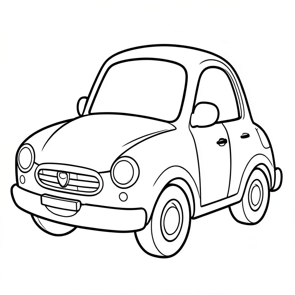 xe hơi. Một chiếc xe nhỏ, mũm mĩm với nụ cười rạng rỡ, thân thiện. Các đường nét dày, riêng biệt phác thảo thân xe. Chiếc xe có màu sắc vui vẻ., trang màu, nghệ thuật đường nét, nền trắng