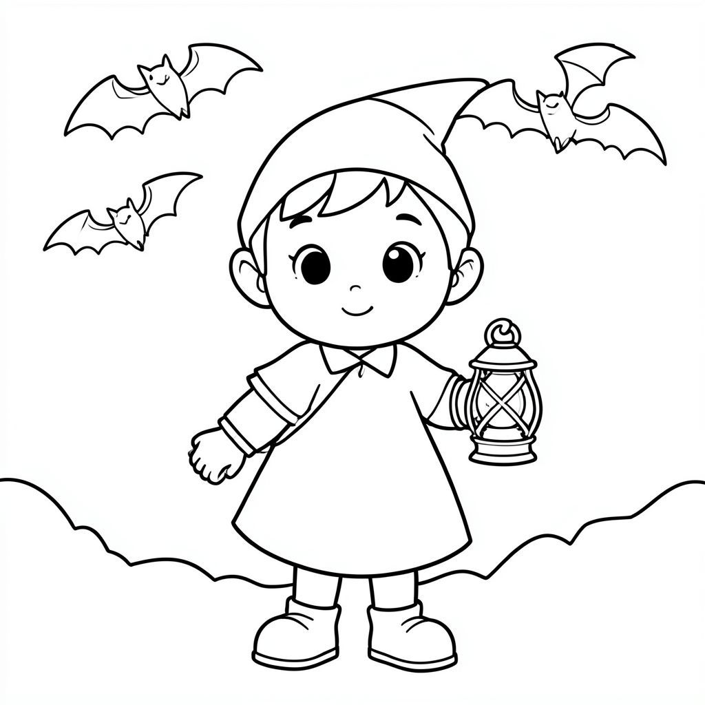 Yêu tinh dễ thương cầm đèn lồng, dơi bay trên mặt đất đen trắng nghệ thuật cho trẻ em"