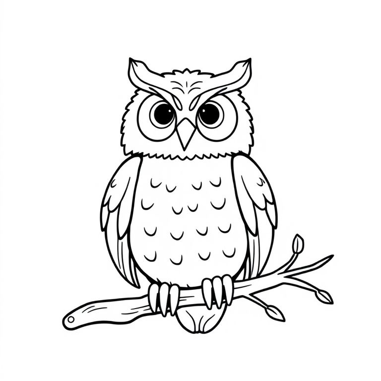 wise owl sitting on a branch, smiling, easy to color