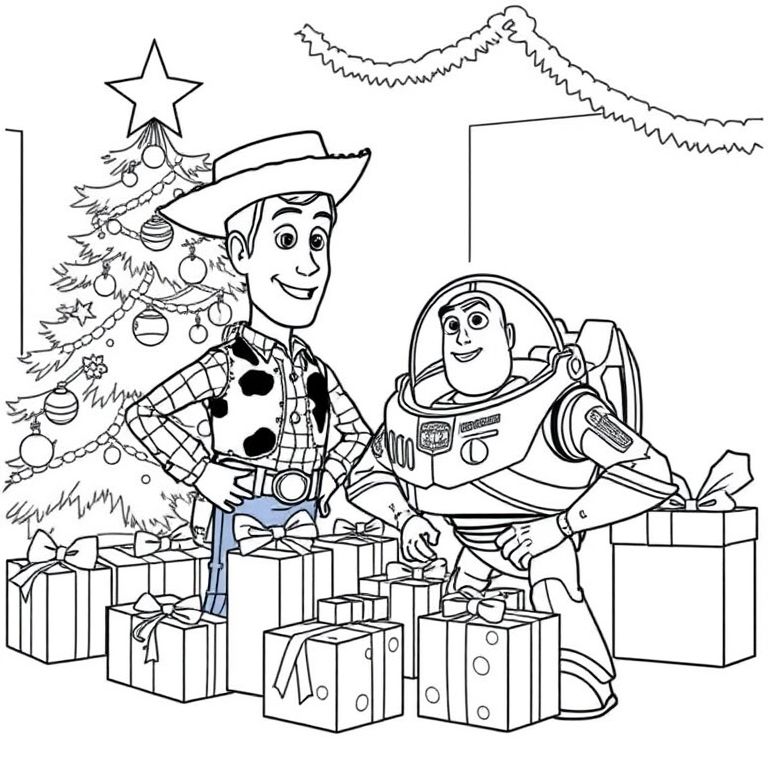 Woody and Buzz gather by the Christmas tree on Christmas morning, surrounded by gifts in this festive Toy Story coloring page.