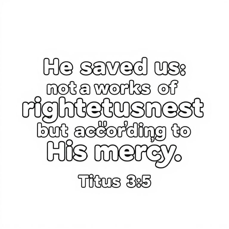 Words: He saved us- not by works of righteousness that we had done, but according to His mercy. Titus 3:5a in white bubble letters